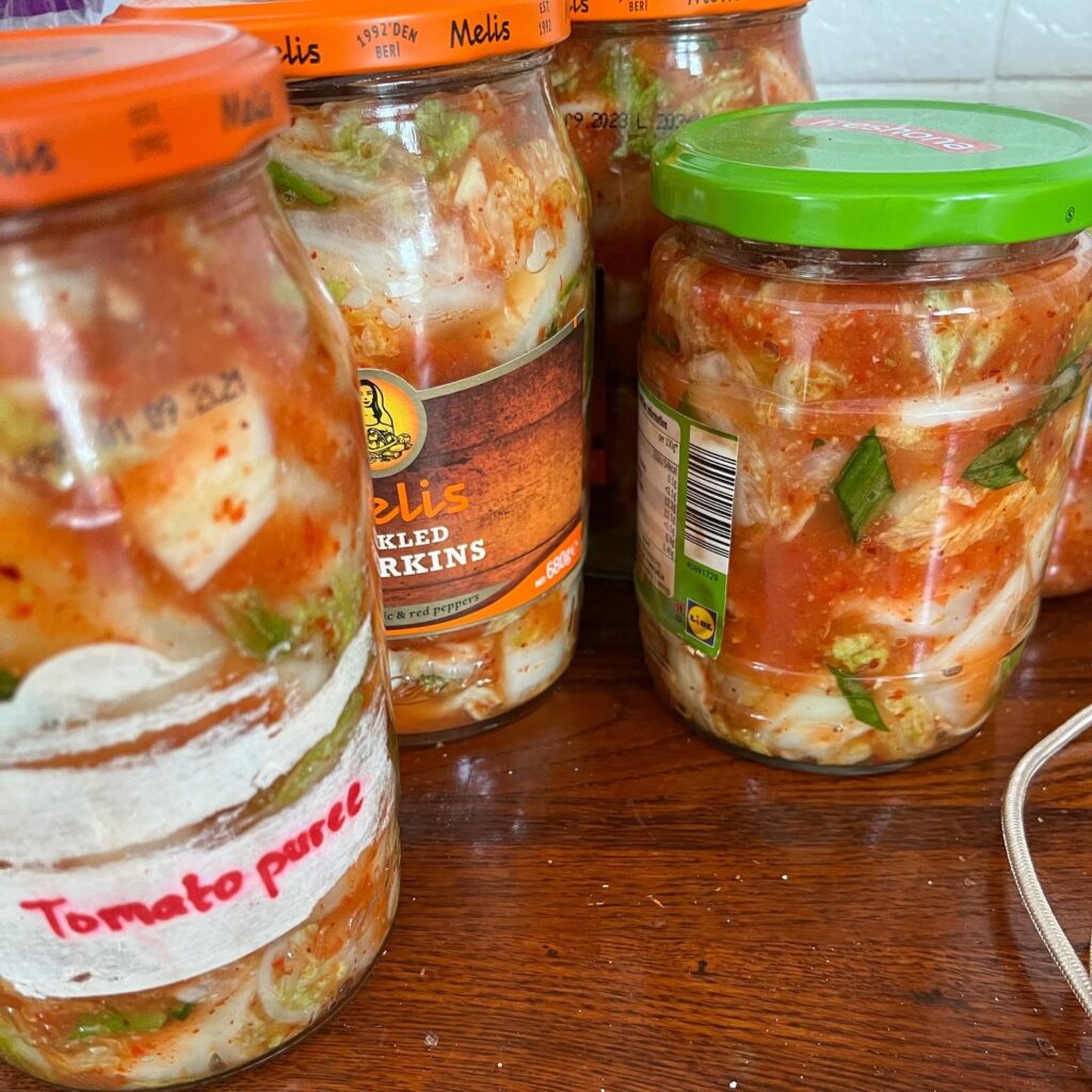Storage: I store the kimchi in various former large (500-700g) pickle/beetroot jars. Prepare about 5, depending on their size.