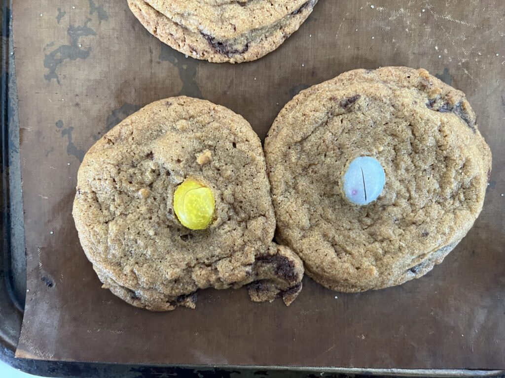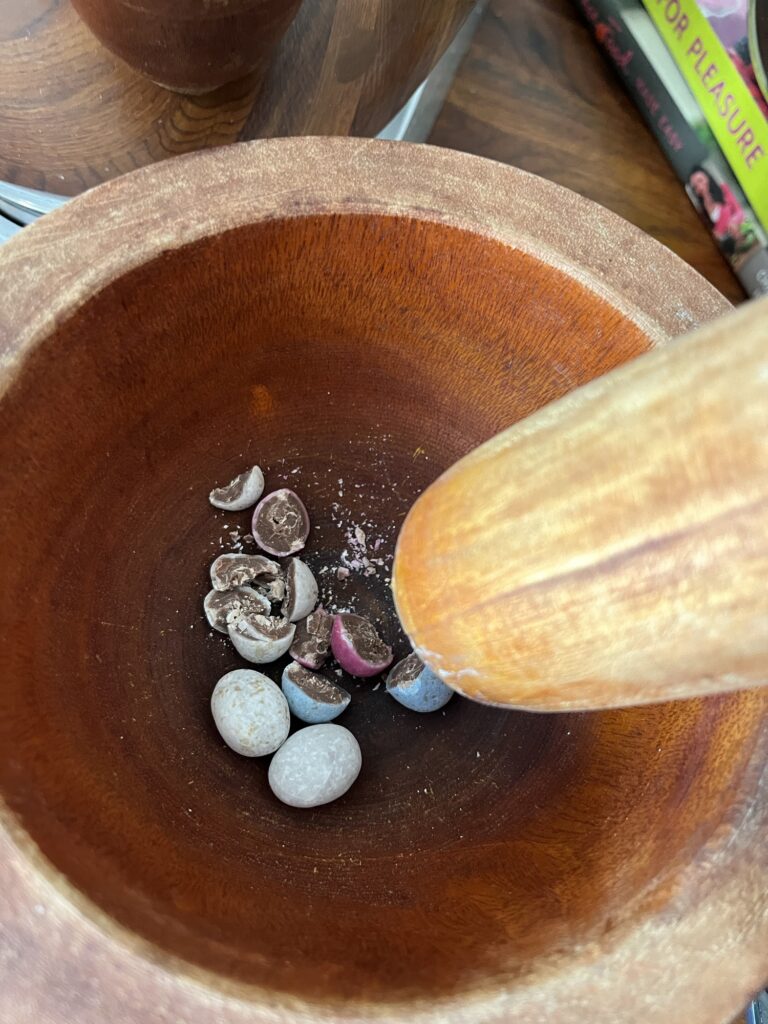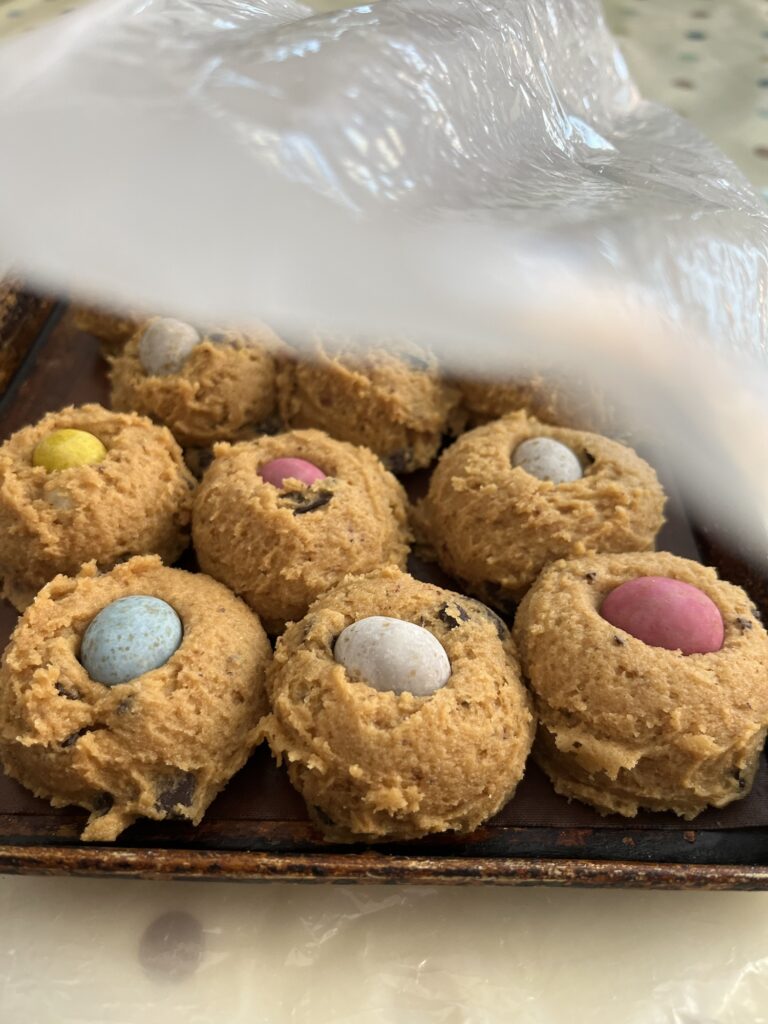 Smashing mini eggs with the pestle and mortarCookie dough scooped, side by side and ready to go in for their rest