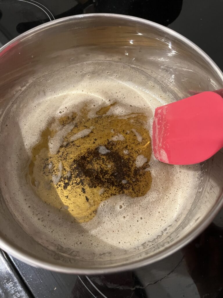 I’ve included two videos on browning butter below as I know that if this is a new thing, it can be off-putting. And I don’t want you to be put off because, remember, I set out for this recipe to be simple. I’ve always done this on a stove top, never in the microwave, so I don’t know if you can. All you are doing is evaporating the water off the butter and as the milk solids brown, it magically releases a nutty flavour. Its French name alludes to this. Beurre noisette, literally translates as hazelnut butter. You will find that I repeat a summary of this in step 1 of the method. First, you melt the butter in a saucepan on a medium heat. The butter will begin to cackle and froth as it melts (listen to Video 1). As the water continues to evaporate, it will make a gentler frothing sound (listen to Video 2). Use a spatula to stir and scrape the bottom so that it doesn’t burn. It is ready, when it is “silent as a ninja” (I quote Stella Parks) (also in Video 2). Then take it off the heat and let it cool. There are two ways really to do this. Option one is to carefully place the pan in some cold water taking care not to splash any water into the pan. This is what I do to save on washing up. Option two is the more orthodox method of pouring the butter into a heat proof bowl, taking care to scrape all the brown bits into the bowl and letting it cool.