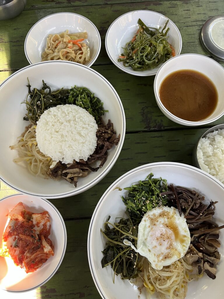Bibimbap, or 비빔밥 in the Korean, is one of my favourite foods. It translates literally as ‘mixed rice’ from 비빔 bibim = mixed and 밥 bap = rice. Traditionally, it comes in a bowl containing rice, a colourful variety of fried or blanched vegetables (which are often 반찬 banchan, Korean side dishes), plus a protein and topped off with a fried egg. You add the sesame seed oil and gochujang, the Korean red chilli paste, to taste and then mix it all up. Bibimbap is infinitely variable, seasonal and nutritious. My favourite is wild mountain greens bibimbap or 산채비빔밥 sanchae bibimbap. Particularly tasty whilst on a mountain hike, but I’ll eat it anywhere.