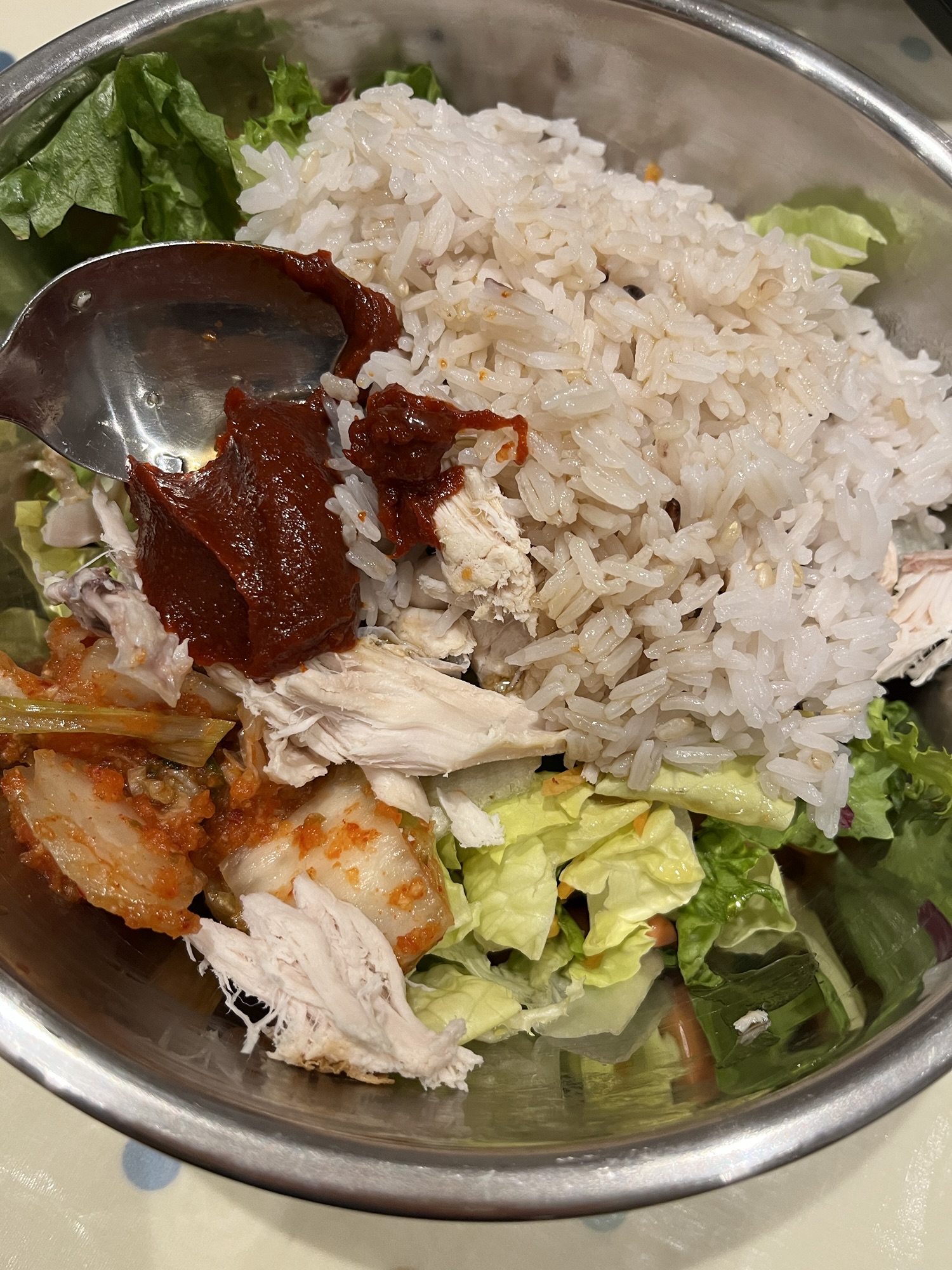 gochujang* and sesame seed oil to taste. *If you have zero spice tolerance, then my family will substitute ketchup for gochujang. Recently, my sister has made and used an Asian-inspired vinagraitte so that it’s kinder to her stomach.