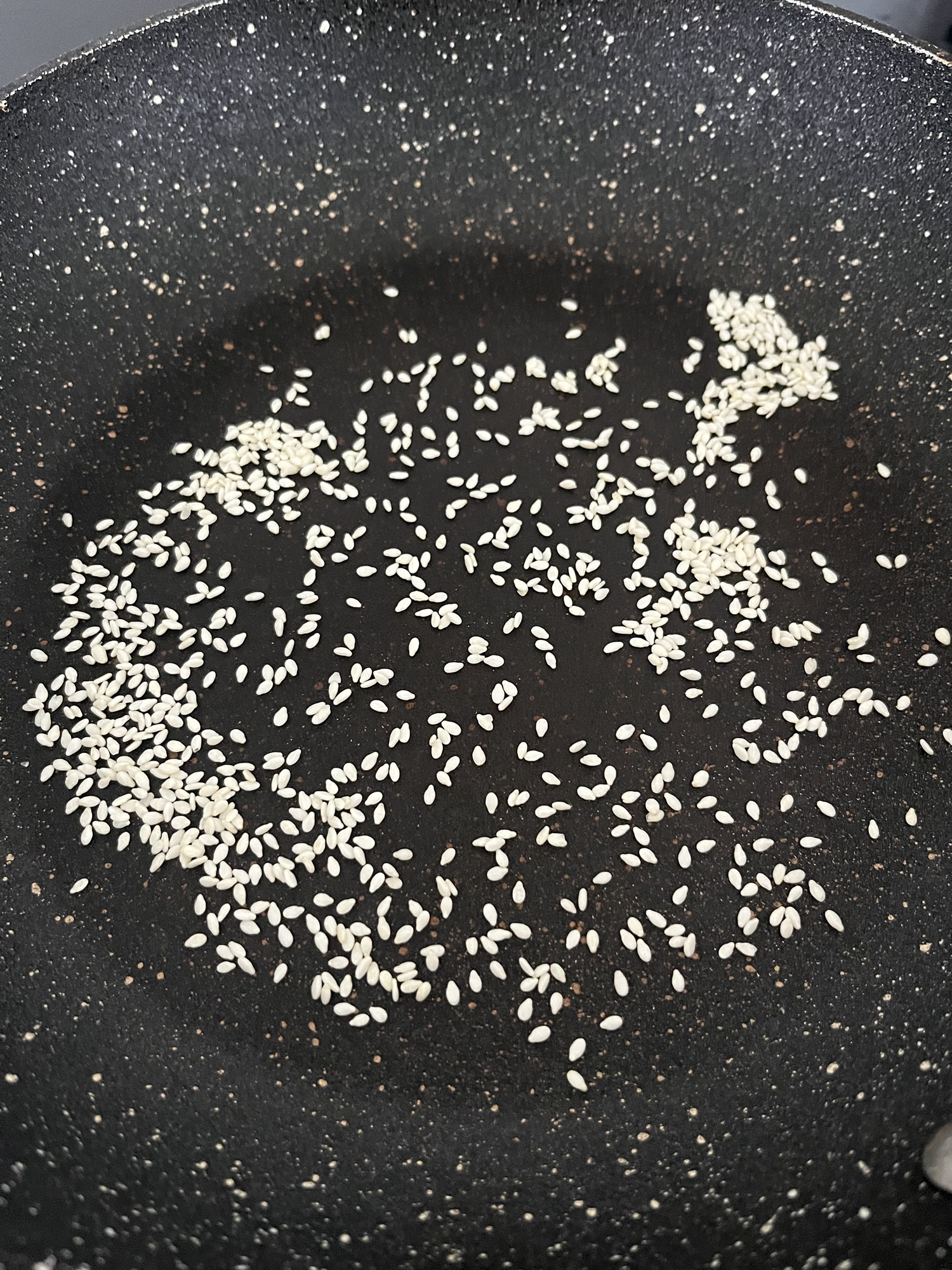 2. Prepping the vegetables4. Now assembled in a bowl4. Adding a protein, this time it’s sardineI added the totally optional step of toasting sesame seeds, just because I wanted to5. Adding the fried egg on top6. Add in your sesame seed oil and gochujang to taste