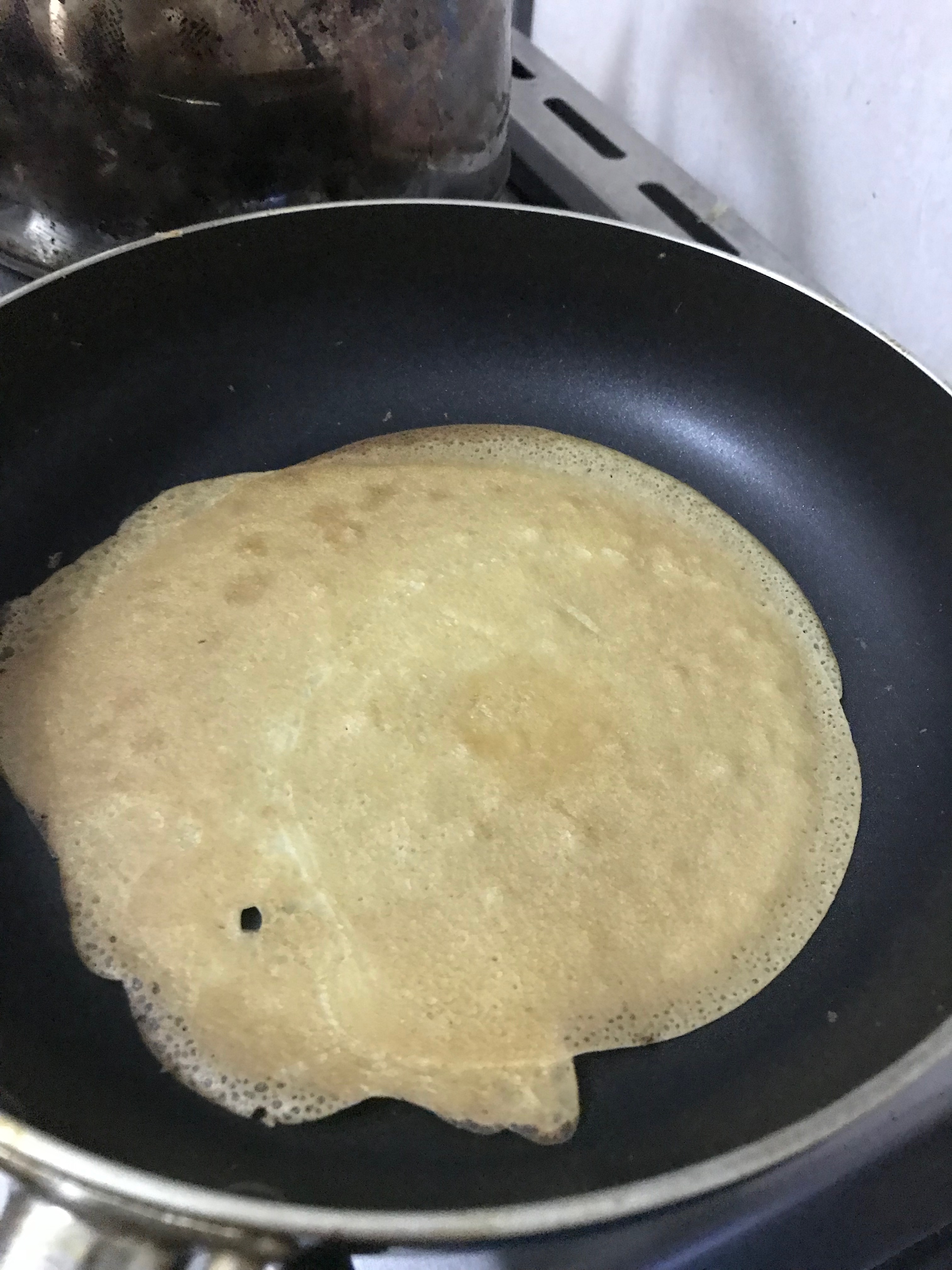Using a small non-stick frying pan, use a moderate to high heat and pour just enough batter into the pan, swirling it around so that it covers the pan. (I’ve linked this to a video but it takes some time to load up.) Gently cook the pancake until small bubbles form on the bottom and it comes away easily from the pan. Flip it over, anyway that you like, cook it on the other side for another minute or two and serve.