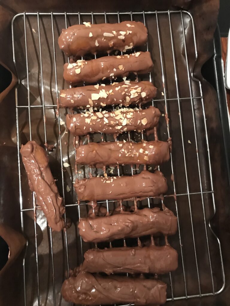 I added a bit of toasted almonds in the biscuit base to add an extra flavour element to it (I’m not sure they did really). I did what one of the contestants did and broke the biscuit as I took it out of the tin. I like making caramel but still scared my housemate a little when I made it. I should have let my milk chocolate cool down a bit more before I dipped the caramel and biscuit into it. However, I was distracted by watching fireworks (it was the day after Bonfire Night) and creating photos in the garden with the family with sparklers making fun shapes. Once the chocolate had sufficiently set enough for us to handle, we ate them with a hot drink whilst watching the Strictly results.