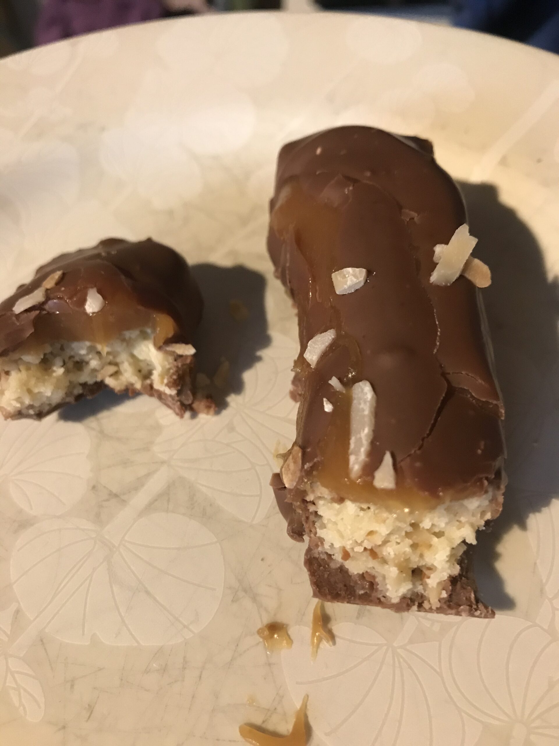 The 5 year old was looking through some of my photos and when she spotted this and said ‘oh look, sausages!’ 😆 I have called them, chocolate sliding off the caramel bars.