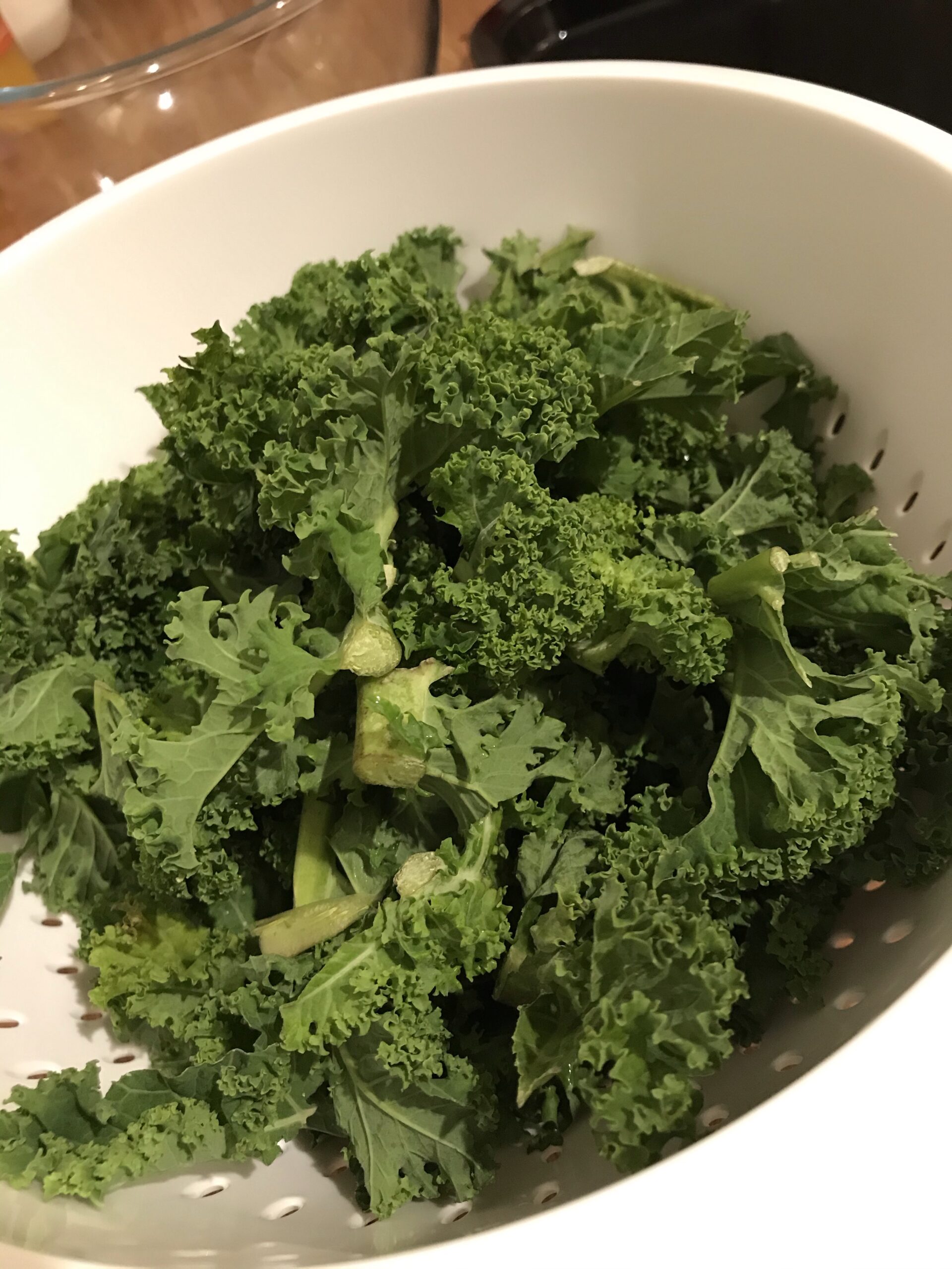 - Prepare the kale. Cut the kale, 2-3cm long. Remove any particularly tough bits of stalk, nearer the bottom of the kale. As you can see from the photos, I don’t really bother that much with removing the stalks because I don’t mind the extra bite. Wash the kale to remove any dirt. Leave it to dry in a colander or alternatively use a salad spinner. Then use a clean tea towel or paper towel to spot dry the kale so that it is as dry as possible.