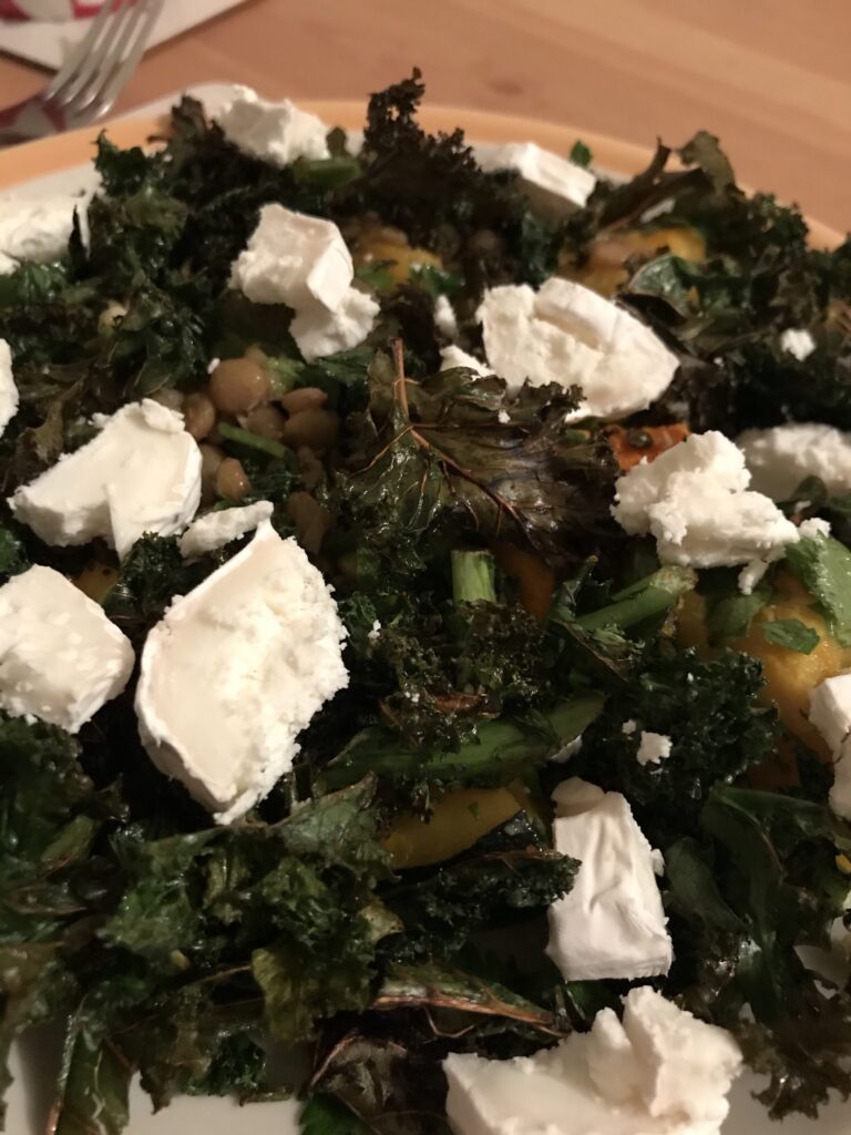 I still had leftover pumpkin, lentil and goats cheese salad in the fridge, so I decided that for dinner that night, I’d crisp up kale and add it to the salad. I had only just mastered it the previous week whilst making a roasted squash risotto with crispy kale.